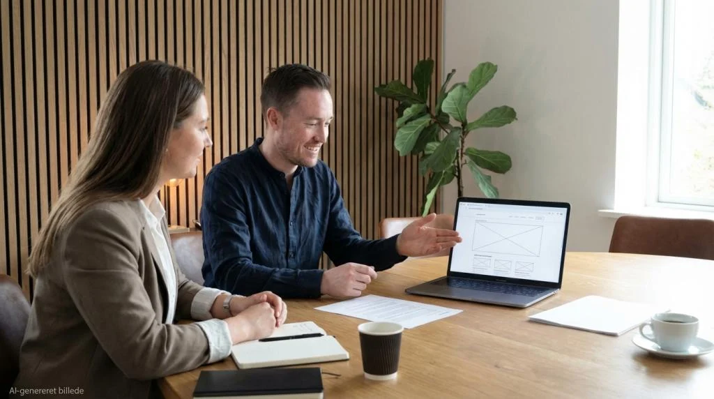 Hvis I har mange interne interessenter, kan en statisk wireframe ofte være den mest rolige start. En klikbar prototype giver typisk mest værdi, når I vil teste et konkret flow, eksempelvis “fra forside til kontakt” eller “fra ydelsesside til booking”.