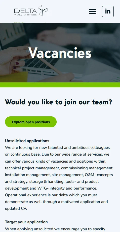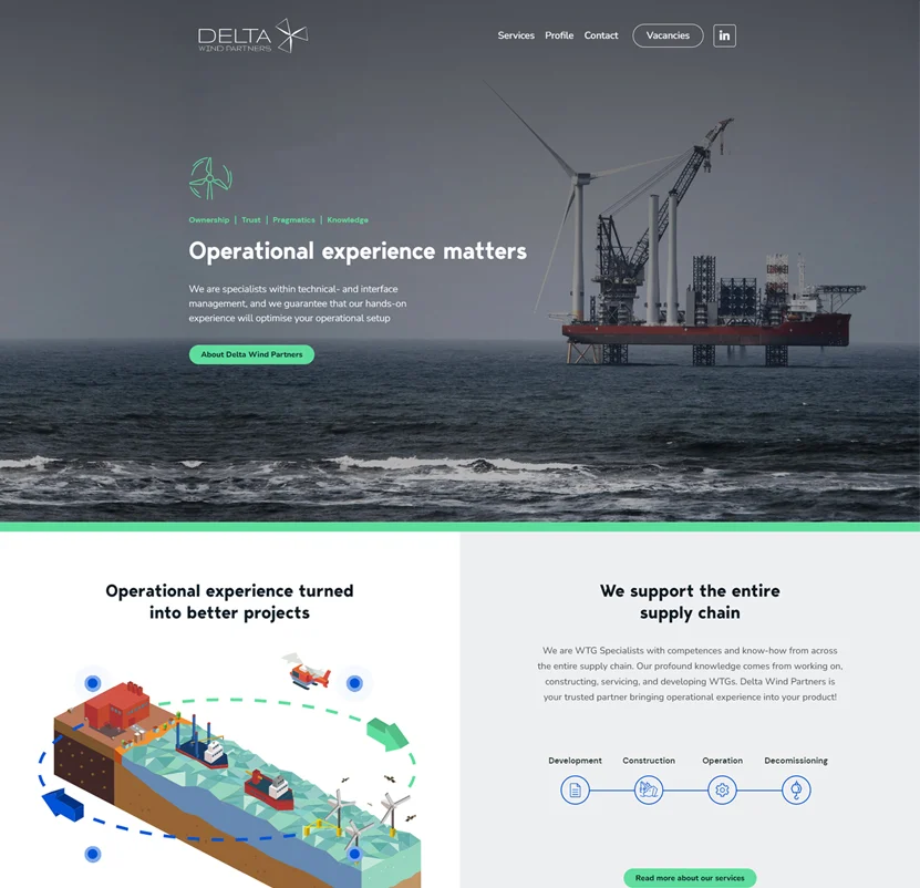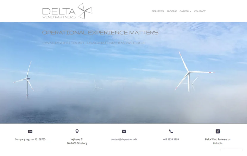Delta Wind Partners arbejder i et internationalt marked, hvor troværdighed og faglig tyngde er afgørende. Deres gamle hjemmeside afspejlede ikke den erfaring og ekspertise, teamet bringer til projekterne. Opgaven var at bygge en hjemmeside, der signalerer operationel kompetence fra første besøg, og som gør det let for potentielle kunder at forstå bredden i deres ydelser.