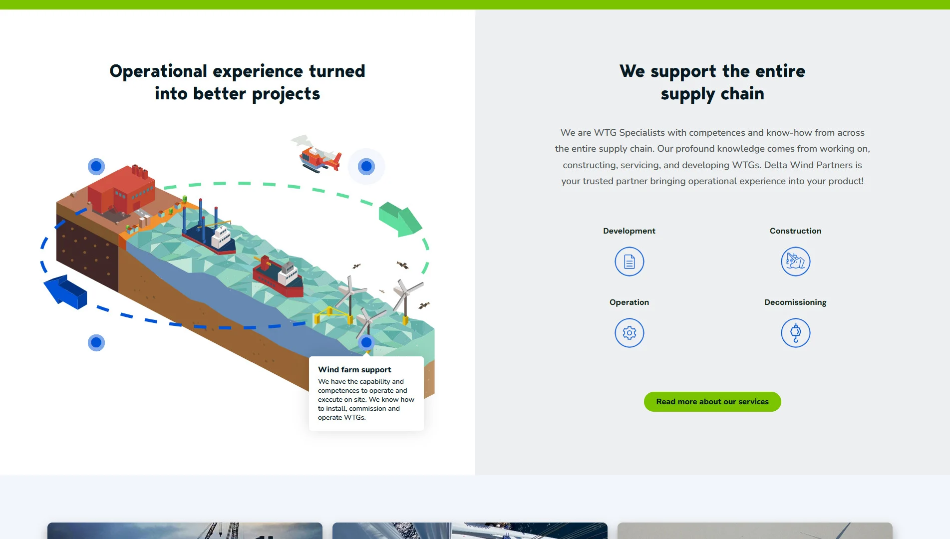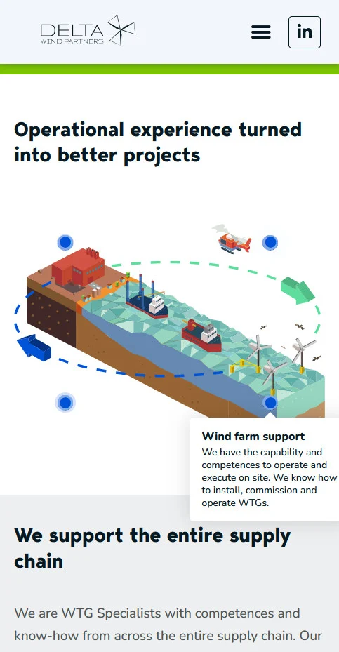 Delta Wind Partners dækker hele værdikæden inden for offshore vind. For at formidle det tydeligt byggede jeg en interaktiv illustration med hotspots og tooltips, så besøgende kan udforske hvert led i kæden på en intuitiv måde.